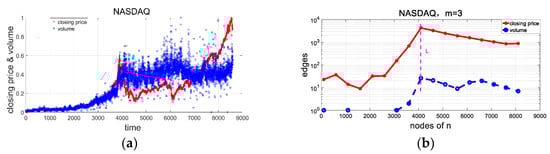 Because edges still exist at m = 3 in the network mapped from the series of stock price index and trading volume, both the stock price index and trading volume series are chaotic sequences. Figure 15b shows that the changing trends exhibited by the edges of closing prices and trading volume are synchronized after n becomes greater than 3000, meaning that NTES appears in the NASDAQ market. It is addressed that the closing price and trading volume are correlative and have the same dynamic attributes. After more than 4000 points (on the right of the line L), the number of edges becomes increasingly smaller, a phenomenon which indicates that, after line L, the randomness of the stock price index and trading volume gradually increases.