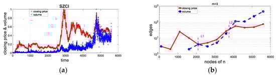 Because edges still exist at m = 3 in the network mapped from the series of the stock price index and trading volume, both the stock price index and trading volume series are chaotic sequences. Figure 16b shows that the changing trends exhibited by the edges of the closing prices and trading volume are synchronized after n becomes greater than 1500, meaning that NTES appears in the Shenzhen market. It is addressed that the closing price and trading volume are correlative and have the same dynamic attributes. However, the randomness of the stock price index and trading volume series appears to change. On the right of line L1, the trend exhibited by the number of edges of the price and volume essentially increases as n increases. Additionally, the number of network edges of the trading volume becomes greater than the number of edges in the price network on the right of line L2. The above results indicate that the price and trading volume jointly construct a chaotic system, and, on the right of line L2, the randomness of the price is greater than that of the trading volume.