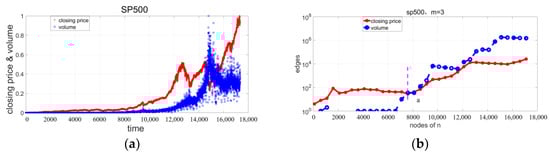 Because of the large time span characterizing S&P 500, to clearly reflect the results only the latter part of the time series is shown in Figure 17a. The S&P 500 index and trading volume series are chaotic sequences. Figure 17b shows that the changing trend exhibited by the closing price and trading volume is approximately synchronous on the right of line L, meaning that NTES appears. Therefore, the closing price and trading volume are regarded as correlative and as having similar attributes. On the right of line L, the changing trend of the number of edges of the price and volume essentially increases as n increases. In the meantime, the number of edges in the volume network is greater than the number of edges in the price network, indicating that the randomness of the price is higher than that of the volume.