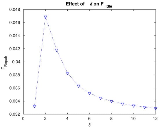 Figure 6. Effect of the repair rate δ on the fraction of time for which the servers are idle.