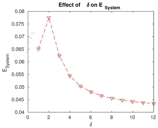 • The system reliability increases with increasing values of δ as expected. The rate at which this increase occurs helps us to decide on the optimum value to be considered when compared to the resources or efforts involved in enhancing the repair facilities; see Figure 7.