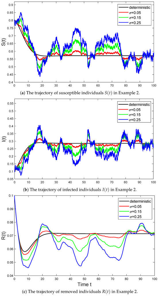 and consider the trajectories of the stochastic SIR model (6) with parameter σ taking values of , , and , respectively. Then Assumption 1 holds with , and we have