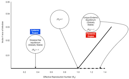Figure 1 demonstrates that when the basic reproduction number grows, the vector force of infection changes qualitatively. This shift could suggest a shift in disease transmission patterns. When exceeds a crucial threshold, the force of infection among vectors may suddenly increase or shift. This could indicate a tipping point in the disease’s ability to spread within the population as labeled at different points on the diagram in Figure 1 showing when the DFE is globally stable at and unstable, and also when the unique endemic equilibrium is globally stable .