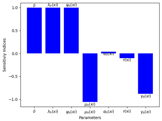 Table 3 shows that three of the sensitivity indices are negative and four are positive. The basic reproduction number’s sensitivity analysis reveals a direct relationship between and the vector’s biting rate, the recruitment term of susceptible humans, and the likelihood that an infectious vector bite will cause a human to contract the disease. In contrast, other parameters have an inverse relationship with . Table 3 and Figure 5 present the sensitivity indices as they relate to .
