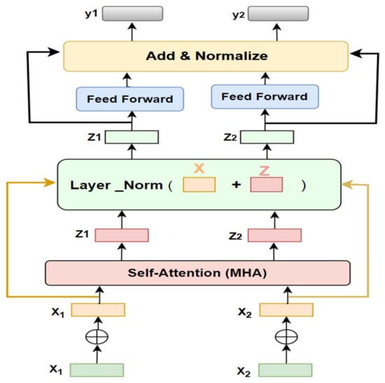 In this context, Q, K, and V represent the query, key, and value matrices, respectively, while , , and signify the weight matrices that have been acquired through learning for the specific head denoted as within the multi-head attention mechanism. and are the weight matrices pertaining to the position-wise feedforward networks (FFNs), and and denote the acquired scaling and shifting parameters used for the layer normalization. Additionally, and refer to the mean and standard deviation, respectively, of the feature activations in the input. The operational process within the transformer structure can be succinctly summarized through the ensuing steps: