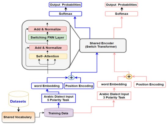 To surmount these obstacles, our research paper introduced a novel switch-transformer sentiment analysis (ST-SA) model, employing multi-task learning (MTL) for the classification of Arabic dialect (AD) sentiments. The objective behind adopting multi-task learning (MTL) was to augment the performance of the five-point Arabic sentiment analysis quandary, capitalizing on the interconnection between the AD SA classification tasks, encompassing both five and ternary polarities. The proposed ST-SA model for ADs was based on the transformer model recently elucidated by Vaswani et al. [20]. MTL exhibits greater efficacy compared to singular-task learning. It harnesses the communal representation of diverse loss functions, concurrently handling SA tasks with three and five polarities, thereby refining the representation of both the semantic and syntactic facets of AD texts. The insights garnered from each task can fortify the learning process of other tasks, enhancing their efficacy. Furthermore, a pivotal facet of MTL lies in its a superior approach to accessing resources devised for akin tasks, ultimately amplifying the learning proficiency of the current task and enriching the reservoir of exploitable knowledge. By means of comprehension, the layers involved in task sharing can amplify the model’s capacity for generalization, accelerate the pace of learning, and enhance its overall intelligibility. Similarly, leveraging the domain expertise embedded in the training cues of interconnected tasks as an inductive bias, the multi-task learning approach facilitates swift transfers that bolster generalization. This inductive transfer can be deployed to refine the precision of generalization, expedite the learning process, and heighten the transparency of the acquired models. A learner engaged in the simultaneous acquisition of numerous interrelated tasks can employ these tasks as an inductive bias for one another, thereby gaining a more profound understanding of the domain’s regularities. This can result in a more practical acquisition of sentiment analysis (SA) tasks for Arabic dialects (ADs) even with a limited amount of training data. Similarly, multi-task learning collaboratively discerns the meaningful interrelation among the acquired tasks. As depicted in Figure 2, the proposed ST-SA sentiment analysis system boasts a distinctive architecture relying on multi-head attention (MHA), MTL, a shared vocabulary, and specialized mechanisms referred to as a mixture of experts (MoE) inside the switching FNN layer. The presented ST-SA model, employing MTL, fine-tunes mixed classification tasks (ternary and five-polarity classification tasks) and comprehends them collectively. The integration of a shared switch-transformer block (encoding layer) streamlines the transfer of knowledge from the ternary task to the five-point task during the learning process, leading to an enhancement in the current task’s (five-point task) learning capabilities.