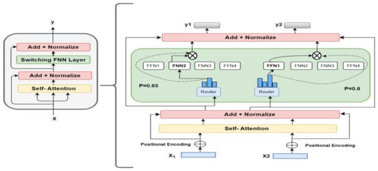 Switch transformers (STs) [19] endeavor to address the limitations found in traditional transformer architectures by integrating a specialized system known as the mixture of experts (MoE). This tactic decomposes complex problems into smaller, more digestible components, thus enhancing the model’s capability to manage longer sequences and complex relationships between inputs and outputs. Notably, the multi-head self-attention mechanism in standard transformers, while adept at identifying semantic relationships in sequences, falters with shorter lengths. The MoE framework allows the model to divide sequences into smaller, more tractable portions, assigning specific expert networks to each, subsequently improving the efficiency and accuracy for tasks with shorter sequences, as evidenced by its superior performance in several benchmark tests [49,50,51]. A critical innovation in switch transformers compared to the original model is the replacement of the conventional feed-forward network (FFN) with the MoE mechanism, as depicted in Figure 3. Traditional transformers utilize an FFN consisting of two linear layers and a ReLU activation function. However, the MoE approach utilizes a suite of expert networks that each analyze different aspects of the input data, integrating their results through a gating network. This allows the model to dynamically adapt and select from a variety of parameter sets or expert modules tailored to the specific input, a marked departure from the fixed parameter approach of the traditional transformer, as described in Equation (4). In a formal manner, the MoE mechanism within the switch transformer can be denoted by the subsequent equation: