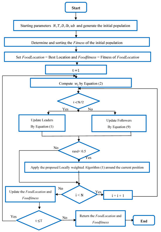 Initially, in each iteration t, a population with the size of Npop Salps and a solution will be optimized by the SSA according to the proposed algorithm and become ; after that, this Salp will be improved by the LW to become by using this formula: