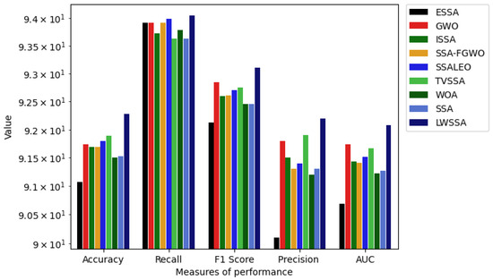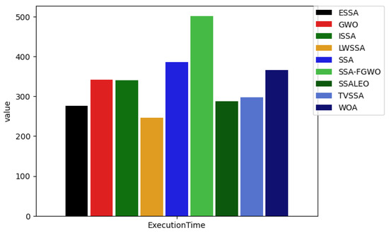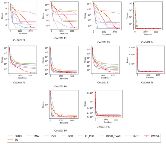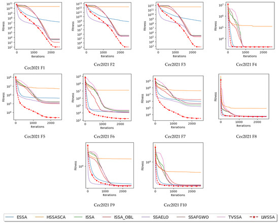 In this subsection, the effectiveness of the LWSSA in solving mathematical CEC2021 test functions is compared to seven other optimization techniques: ESSA [61], HSSASCA [62], ISSA [63], ISSA-OBL [64], TVSSA [65], SSALEO [36], and SSA-FGWO [34]. The size of the population and number of members for these optimization techniques were both over 30 and 2500, respectively.