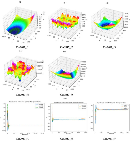 This paper presents a novel optimization strategy called the LWSSA that combines a locally weighted approach with a mutation scheme to overcome the limitations of traditional SSA methods. The LWSSA aims to address issues such as early convergence, uneven exploration and exploitation, and population heterogeneity. The paper investigates the performance of the LWSSA in five functions (Function 1, Function 2, Function 3, Function 8, and Function 9) from the CEC 2017 benchmark (see Figure 4a), specifically focusing on both uni-modal and multimodal functions. These examples were chosen due to their representative nature and significant influence. The qualitative results of the investigation are displayed in Figure 4, which shows the LWSSA’s expected exploration and exploitation phases and its average global best fitness level as it traverses along its first-dimensional trajectory.