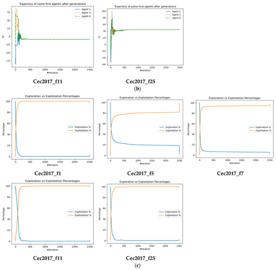 The graphical representation in Figure 4c also highlights the LWSSA’s planned exploitation and exploitation phases, with the initial algorithm having a high exploration ratio but a low exploitation ratio. However, as iterations progress, the focus shifts towards exploitation for most of the chosen functions, and the LWSSA strikes a balance between exploration and exploitation.