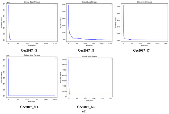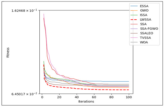 Furthermore, Figure 4d shows that the LWSSA’s global fitness has a tendency to fluctuate during iterative approaches, but its average fitness value decreases and oscillation frequency decreases with increasing iterations, allowing it to thoroughly search the entire space and rapidly arrive at a trustworthy conclusion.