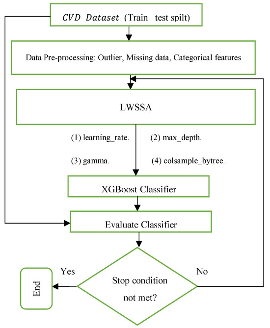 To assess the efficacy of the LWSSA, a series of tests were managed using the IEEE CEC 2017 and IEEE CEC 2021 function groups. These tests were designed to evaluate the optimization performance of the LWSSA and were managed under the same operating conditions, with a number of sophisticated algorithms used for comparison. The LWSSA was also applied as a search algorithm to find and localize the values of the optimal hyperparameters for the XGBoost Classifier for risk assessment of cardiovascular disease classification. Further information about the risk assessment of cardiovascular disease problems and their characteristics can be found in a subsequent subsection.