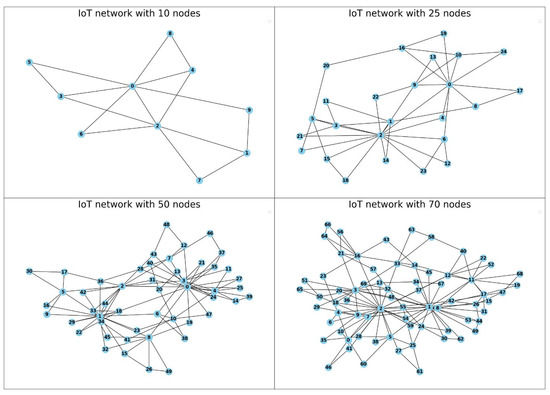 Examples of IoT networks generated with the NetworkX powerlaw_cluster_graph function with a different number of nodes.