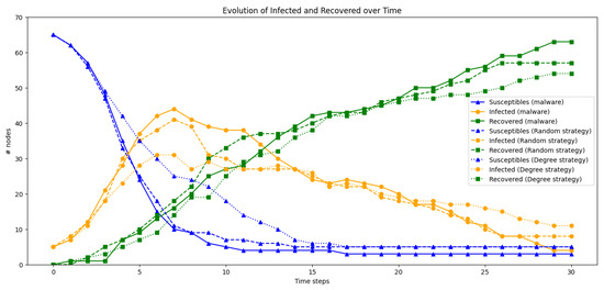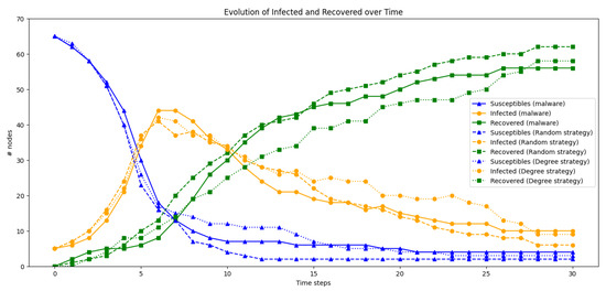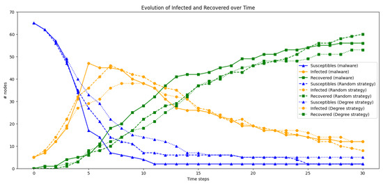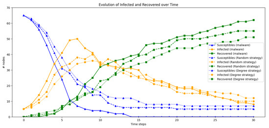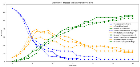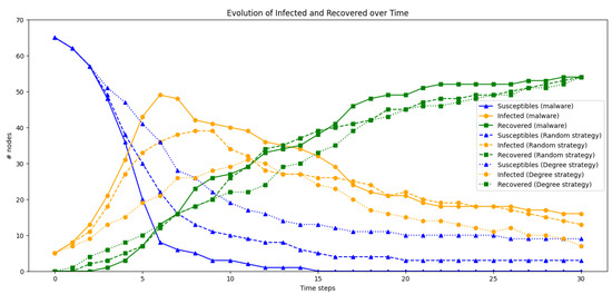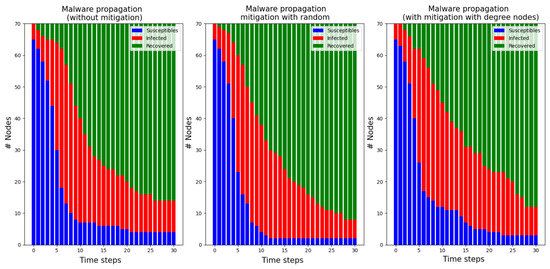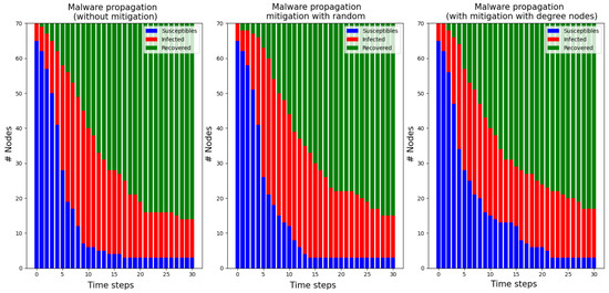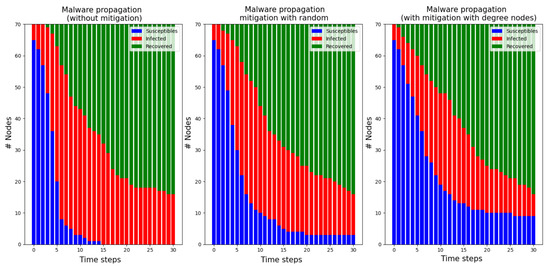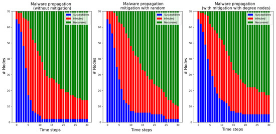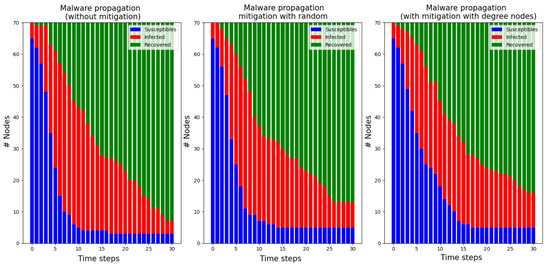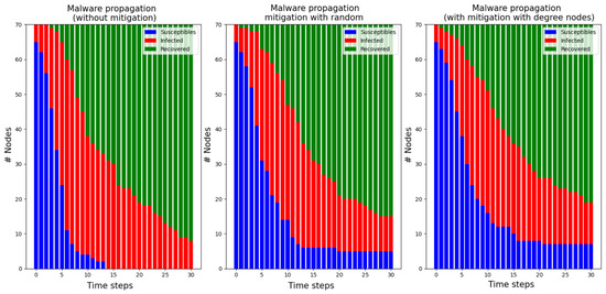 In this simulation, the malware was detected early. However, the automatic patching system experiences a two-time step delay, resulting in the security update being implemented at time step 3. In this scenario, it is apparent from Figure 10 that the mitigation strategy involving random node selection and the spread of malware without any implementation of mitigation measures displays a similar behavior. However, the strategy based on node selection according to the degree outperforms it, ensuring that the number of infected nodes remains below 40% of the total network. Figure 11 reveals that in none of the three cases could a high number of IoT nodes maintain the susceptible state, indicating that the malware did not infect them. Furthermore, node recovery behavior was similar across all three cases.