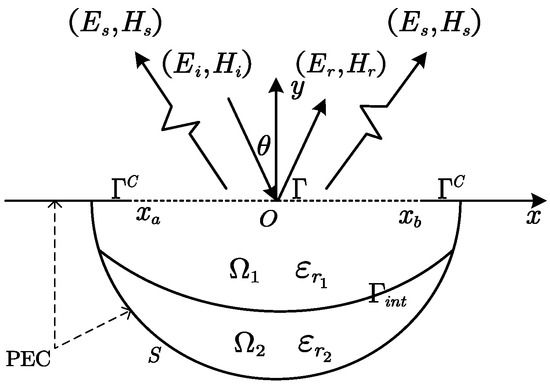 We investigate the scattering of a partly covered groove injected by the indent wave with an incident angle of , embedded in the half plane of a perfect electric conductor, as shown in Figure 1. is the incident electric field and the magnetic field. and express the reflected field and the scattered field, respectively. The groove domain is divided into two subdomains, and . Let be the relative permittivity of the medium filling in . Similarly, is the relative permittivity of another medium. The permeability of non-magnetic media filling in the whole groove and the half plane is set to the permeability of the free space. The interface between the two media is denoted as . Let be the aperture of the partly covered groove, whose endpoints are and . and the boundary S are the surface of the perfect electric conductor.