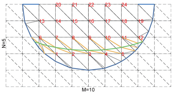 We consider the semicircular partly covered groove as an example for a detailed discussion, as shown in Figure 2. The blue curve represents the groove boundary and the covered aperture, and the green curve represents the interface between different media. The yellow lines only appear when the media interface intersects with the uniform triangular element. The red markers represent the global node number, i.e., the degrees of freedom for a linear system generated by the scattering problem.