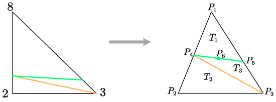 We consider the treatment of the triangle that intersects the media interface. Let us take a triangle with node numbers 2, 3 and 8, as shown in Figure 3. First, the nodes are renumbered. are the intersection points of and the interface, respectively. is the midpoint of . Let belongs to and belong to . We consider the jumps at and