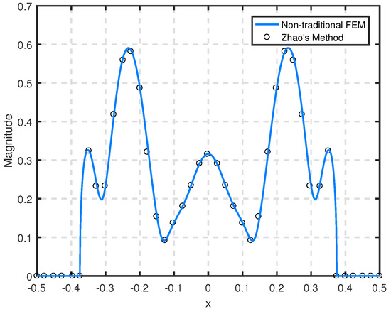 First of all, we assume that the groove in the left picture of Figure 7 is empty, i.e., , and the wave number is . It is apparent from Figure 8 that the results calculated by our method are in good agreement with Zhao’s in [3], which shows that the non-traditional finite element method can efficiently solve the groove scattering problem. Additionally, Table 2 shows that our method still has a second-order convergence rate at norm and norm when the wave number is relatively high, which is similar to the conclusion in Example 1.