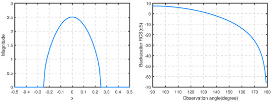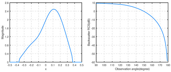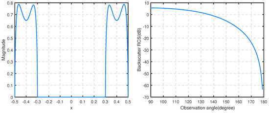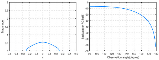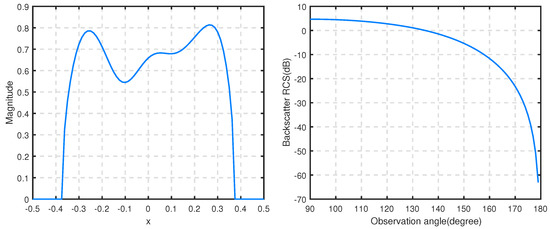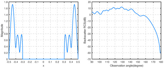 Let the wave number be , the magnitude of the aperture field at the normal incidence and RCS of the asymmetric groove with are presented by Figure 15 and Figure 16. Combing Figure 14, we can conclude that the asymmetry of the magnitude plot is justified due to the asymmetry of the groove. The backscatter RCS and the magnitude of the aperture field from the groove filled with a medium with a complex permittivity are both reduced greatly, similar to Example 3.