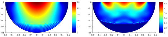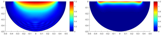 A semicircular groove filled with two media is considered in Figure 17. The radius of the semicircular groove is 0.5 m, and the two ends of its aperture are covered by 0.125 m. The level set function of the interface is .