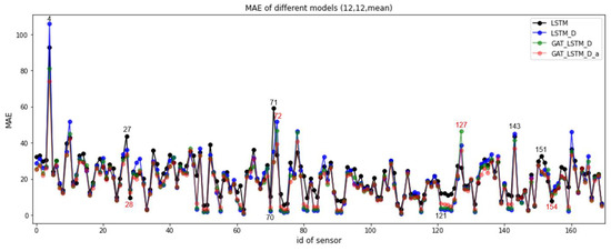 The assessment of the model’s overall performance relies on the average prediction errors of the entire traffic network. In this section, we conduct a detailed examination of the model’s node-wise performance. Figure 3 illustrates the experimental models’ MAE and MAPE distributions across the sensors (nodes) in the traffic network when and (the prediction horizon is 60 min). A model with superior overall performance across the network does not guarantee equal performance at all nodes. In Figure 3, GAT-LSTM_D_a achieved significant improvements at most nodes with the use of MAE, including nodes 4, 27, 70, 71,121, 143, 151, etc. However, it failed to make improvements or resulted in larger errors at some nodes compared to LSTM, such as nodes 28, 72, 127, 154, and 155 (labeled in red in Figure 3). Similar patterns are observed for RMSE, MAPE, and SMAPE. Moreover, by comparing the node-wise performance of GAT-LSTM_D and GAT-LSTM_D_a, we note that GAT-LSTM_D can reduce errors to levels below those of GAT-LSTM_D_a for nodes at which the errors are relatively small, such as nodes 70, 121 to 125, etc. However, GAT-LSTM_D_a plays a more significant role in minimizing errors at nodes where the errors are relatively large, such as nodes 4, 27, 71, 143, etc. In the worst cases, where neither GAT-LSTM_D nor GAT-LSTM_D_a succeed in reducing the error, such as at nodes 28, 72, 127, and 155, GAT-LSTM_D_a is observed to be closer to the best results (that are achieved by LSTM). In conclusion, GAT-LSTM_D_a demonstrates superior adaptability to various types of nodes with distinct data patterns, making it more versatile for handling diverse scenarios compared to GAT-LSTM_D. Indeed, GAT-LSTM_D can be regarded as a specific case of GAT-LSTM_D_a, where the attentions assigned to GAT, LSTM, and Dayfeature are fixed.