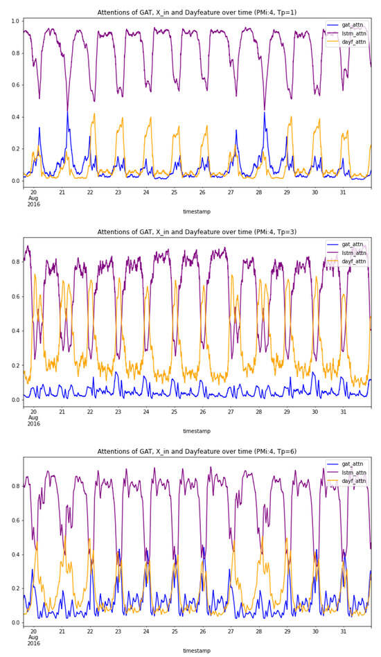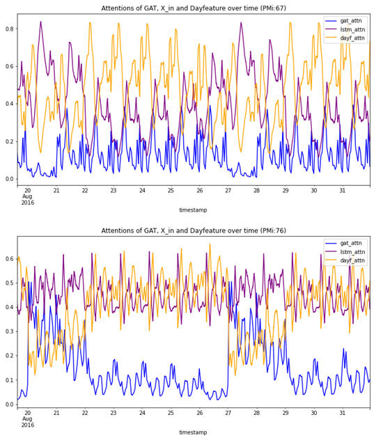 As stated in Section 2, in the proposed GAT-LSTM architecture, the initial processing using GAT layers helps to capture meaningful relationships in the traffic network and provides valuable context and input for subsequent processing at LSTM layers. Thus, the GAT attention of a node also reflects the degree of spatial dependence of the traffic states at that node. Similarly, the attention assigned to the original traffic sequences indicates the degree of correlation with historical traffic states, and the attention assigned to the Dayfeature indicates the degree to which traffic conditions at specific nodes are influenced by external factors, such as time, day, weather, etc.