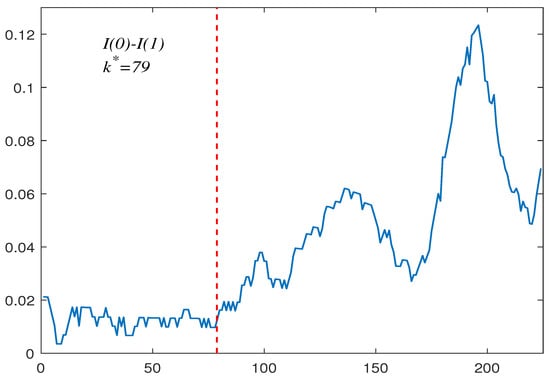 The above tests are designed to detect a change in persistence with finite variance and do not consider heavy-tailed series with infinite variance. However, Mittnik [14] argued that many types of data on economics and finance have a heavy tail character. It is of greater practical significance to test for the change point with heavy-tailed observations. Therefore, many scholars have paid more attention to the detection of change in persistence under heavy-tailed time series models. In the case of the process null hypothesis, Han [15] used the ratio test statistic to consider the change-point detection with heavy-tailed innovations and proved its consistency as there is a persistence change presence. For the problem of the null hypothesis of the process and the alternative hypothesis involving a change in persistence switching from to , Qin [16] applied a Dickey–Fuller-type ratio test statistic to study for infinite variance observations. Related to online monitoring issues, Chen [17] adopted a kernel-weighted quasi-variance test to monitor the persistence change in heavy-tailed series. For more persistence change estimation and detection in heavy-tailed sequences with infinite variance, see Yang [18], Jin [19], Jin [20], and Wang [21].