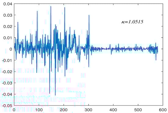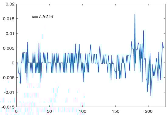 We can see the following regularities from the results in Table 2 and Table 3. Firstly, when (null hypothesis, ), the empirical size tends towards the significance level of 5%. As the tail index decreases, the experience size does not fluctuate greatly, for example, when , the empirical size of the is 0.0473, 0.0403, and 0.044 for , which still tends towards a nominal level. Notice that the empirical size under is better than that under or , which indicates that the dependency of the innovation process has some influence on the test. Secondly, for the vast majority of the entries in Table 2 and Table 3 pertaining to (cases where , ), the empirical rejection frequencies of both the upper and lower tails -test are seen to lie well below the nominal level, as predicted by the asymptotic unbiasedness result of Theorem 3. The empirical rejection frequencies increase gradually with the decrease in the tail index, and the empirical rejection frequencies of are generally higher than that of , but still lower than the nominal level. It is worth noting that even when , the empirical rejection frequencies are much smaller than the nominal level, which indicates that the proposed test statistic is conservative under the process. However, when , and , empirical rejection frequencies are severely distorted, such as when and empirical rejection frequency of is 0.514. What is interesting is that this phenomenon only occurs in the case of , and there is no distortion for . Finally, in the case of near-integrated time series, the empirical rejection frequencies are not high enough to reject the null hypothesis. Especially when , the empirical rejection frequencies tend to the significance level, which confirms the conclusion of this paper, that is, when is smaller, the sequence is closer to the process (null hypothesis). Similarly, with the increase in , the empirical rejection frequencies of the gradually increase, while that of the gradually decreases. In summary, the straightforward result is that a test based on will be conservative when run at conventional significance levels and will never be rejected under a near-integrated time series in large samples, regardless of whether this is in i.i.d or a dependent innovation process.