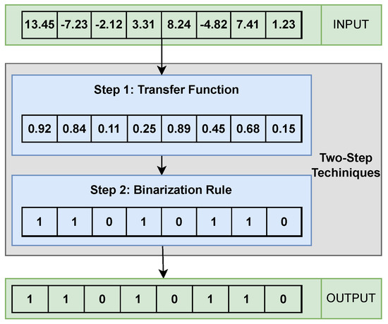 The two-step technique, as its name suggests, performs the binarization process in two stages. In the first stage, a transfer function is applied, which maps continuous solutions to the real domain . Then, in the second stage, a binarization rule is applied, discretizing the transferred value, thereby completing the binarization process. Figure 3 provides an overview of the two-step technique.