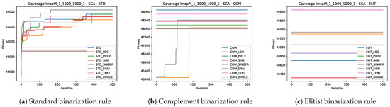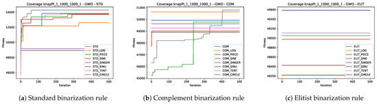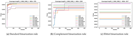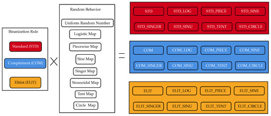 As shown in Section 2.2, there are different chaotic maps; some of them can encourage exploration, and others can encourage exploitation. Thus, each original binarization rule will be compared with seven new chaotic variants for each binarization rule; these are detailed in Figure 5.