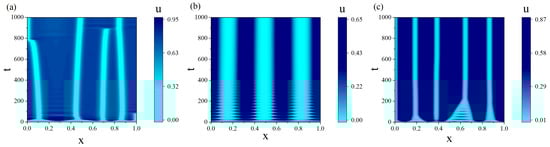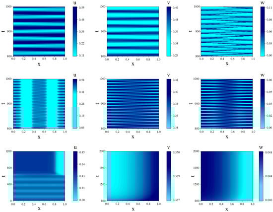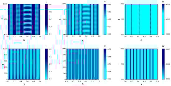 Figure 3 shows the spatial patterns for ; in this case, Turing and wave bifurcations are possible. For and , after a certain incubation period, stationary patterns emerge. When , only Turing bifurcation occurs. Figure 4 demonstrates the system dynamics for and . For (), the system generates a spatiotemporal pattern oscillating in space and time (top panel). This behavior indicates that nonlinear effects arising from the interaction between the Turing and wave modes cause the pure Turing mode to lose its stability before the wave bifurcation occurs. With an increase in , the spatial structures achieve equilibrium (bottom panel).