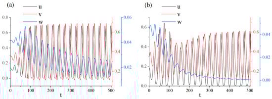 Spatially homogeneous solutions to System (3) with an unstable spatially homogeneous equilibrium as the initial state: (a) , ; (b) , , .