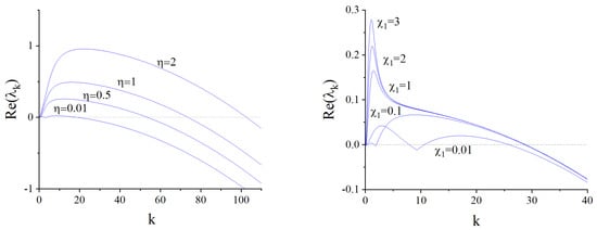 The local stability of the positive equilibrium for the homogeneous model is a necessary condition for Turing and wave instability. Let ; then (16) are satisfied for , and is the stable homogeneous stationary state. Moreover, . The equilibrium loses its stability if one of the two remaining conditions in (16) is violated. If for some , then Equation (15) has one positive real root: this implies that Turing instability occurs, and there exist nonconstant positive steady states for System (3). If for some , then Equation (15) has a pair of complex roots with a positive real part: this means that wave instability occurs.