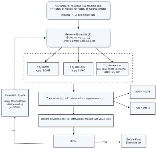 In the existing literature, studies have predominantly focused on applying a single hyperparameter optimization algorithm across all models within an ensemble. However, it has been observed that not all hyperparameter optimization algorithms yield the best results for every model; different models can often benefit from different optimization strategies [,]. Our study introduces innovations on two fronts. First, it explores new ground by applying hyperparameter optimization to the domain of ensemble generation for clustering problems, an area in which this technique has not been applied before. Second, we adopt a customized strategy in which, during the generation stage, each model is optimized using the hyperparameter optimization method best suited to its unique features. This methodology aims to maximize the overall performance by selectively applying the most effective optimization strategy for each individual model in the ensemble, thereby potentially enhancing the accuracy and robustness of the resulting clustered outcomes.