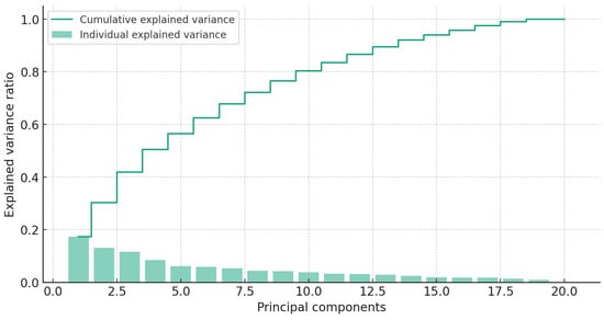 Principal component analysis (PCA) is used to minimize the feature space and extract the important information from high-dimensional datasets, thus reducing the problem of dimensionality []. PCA operates by identifying the eigenvectors of the data’s covariance matrix , which align with the largest eigenvalues :