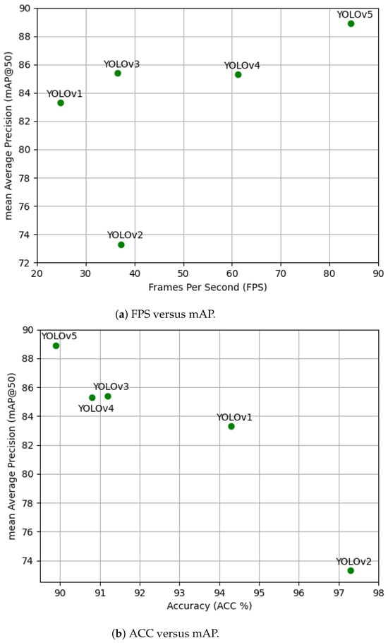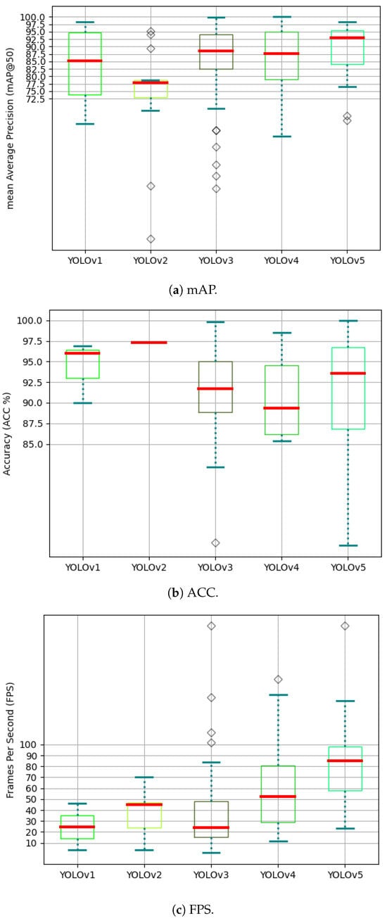 It is important to mention that this research has only considered the five fundamental versions of the YOLO object detection algorithm. Other variants have been compressed into the original models, for example, the YOLO tiny.