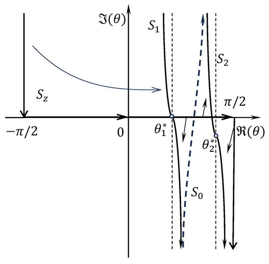 Figure 1 shows the deformation of the Sommerfeld contour into a series connection of contours, , when the function has two saddle points. The integral over the contour disappears according to the Riemann–Lebesgue lemma [18], since the contour does not contain a saddle point. Hence, the Sommerfeld contour can be replaced by the contours and passing parallel to the imaginary axis through the saddle points and on the complex plane .