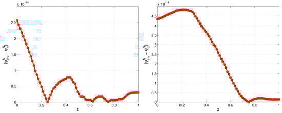 Genuchten model. Numerical solution of the direct and inverse problems, (left) and the corresponding absolute difference (right) at final time for , , Example 2.