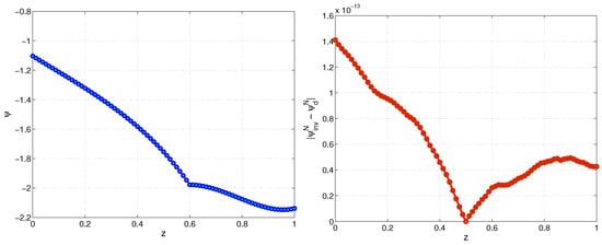 Next, we examine Genuchten model (12)–(14) and (15). In Figure 8 and Figure 9, we depict numerical solution of the direct and inverse problems for and , respectively. Figure 10 represents the exact and recovered left boundary for and . In the case of , the average number of iterations is , while for it is .