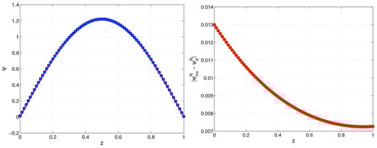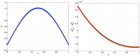 Exponential model. Numerical solution of the direct and inverse problems, (left) and the corresponding absolute difference (right) at final time for , , Example 2.