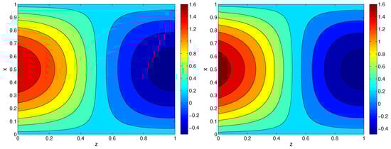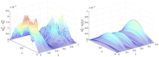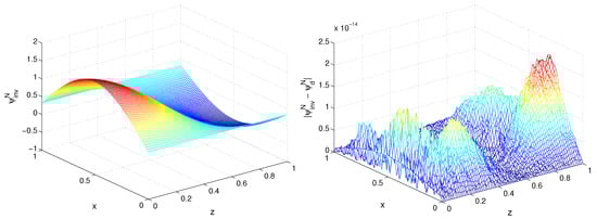 As in 1D case, we conclude that the order of convergence of the numerical solution of the inverse and direct problems is . Moreover, the solution obtained by Algorithm IP-2D recovers exactly the numerical solution of the direct problem.