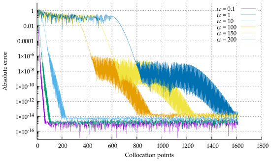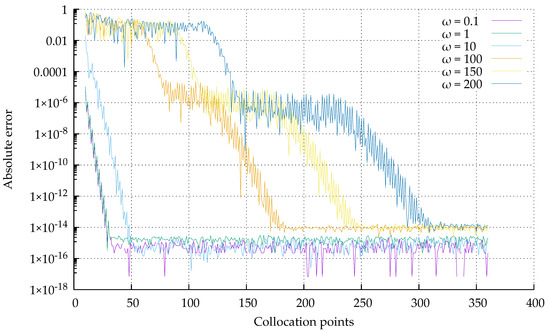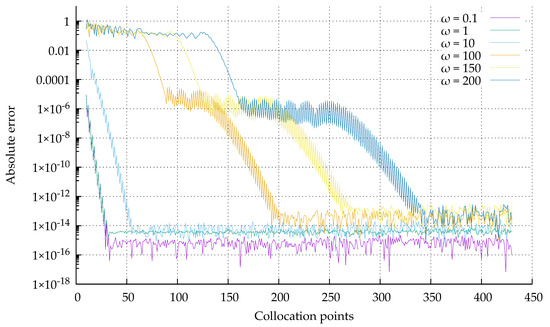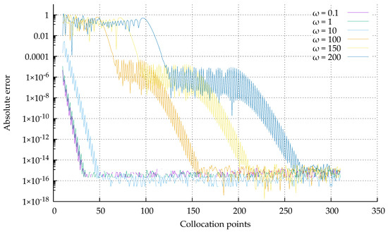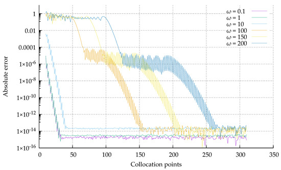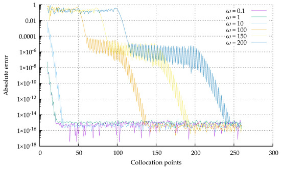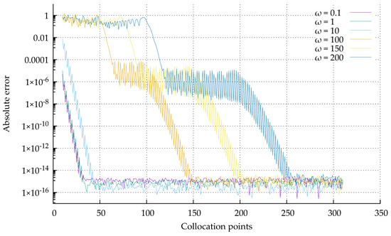 In this example, the absolute error function behaves in the same way. As in the previous case, at small frequencies it is sufficient to consider a small number of collocation points to achieve high accuracy. With an increase in the integrand function frequency, to ensure a high accuracy it is necessary to increase the number of colocation points to .