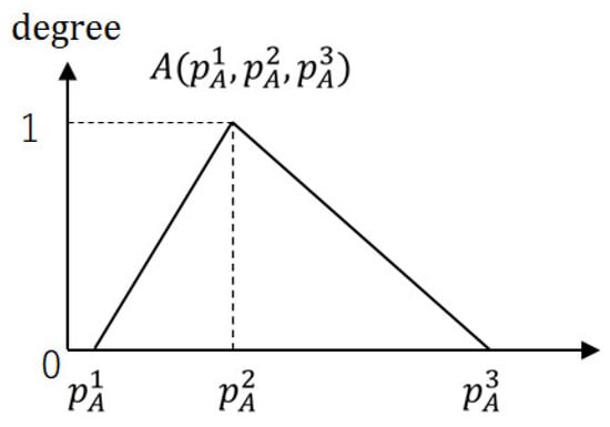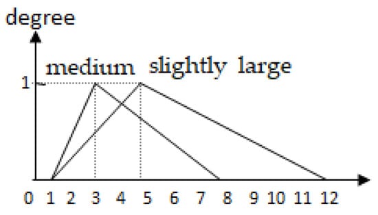 Fuzzy sets, delineating vague concepts, are defined by membership functions [6,7,8]. Ambiguous concepts are quantified through graphical information along a horizontal axis, with values spanning the closed interval [0, 1]. For instance, in Figure 1, the graphical representation of two triangles on a horizontal axis quantifies the ambiguous concepts of “medium” and “slightly large”.