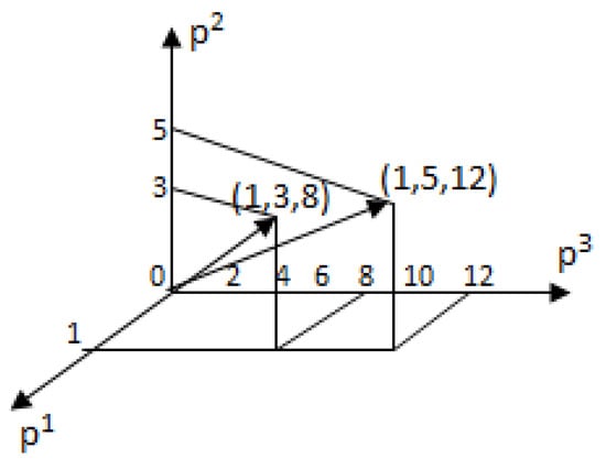 In this paper, parameters that are mutually independent and can fully characterize the features of a figure in a plane or in a space are termed “characteristic parameters”. A Euclidean space with the same number of independent variables as characteristic parameters is referred to as a “feature space”. When a figure representing a specific meaning is projected onto the feature space, it transforms into a singular vector. In other words, this vector can completely express the characteristics of the original figure. For instance, by substituting the values (1, 3, 8) and (1, 5, 12) for the characteristic parameters , two triangles, A(1, 3, 8) and A(1, 5, 12), representing “medium” and “slightly large”, respectively, are formed, as depicted in Figure 1. When these two triangles are mapped to the feature space, two vectors in the feature space, as illustrated in Figure 3, are generated. These vectors entirely capture the characteristics of A(1, 3, 8) and A(1, 5, 12). Although the feature space of a polygon with 20 line segments has more than four dimensions, making its vectors challenging to visually confirm, it possesses the essential properties of a vector and serves as a faithful representation of the original shape.