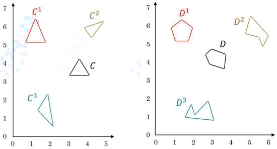 On a plane or in a space, meanings and concepts can be conveyed through information about the shape and position of a figure, along with other graphical details [27,28]. For instance, concepts like “doll”, “animal”, “star”, “building”, “truck”, and “airplane” can be visually represented by manipulating the coordinate values of line segments in a 20-sided polygon. The information within these figures, represented by the coordinates of the polygonal line segments, can then be utilized to quantify the aforementioned concepts. Therefore, the coordinate values of the line segments serve to quantify the concept and correspond to the function of the membership function used for quantifying ambiguous concepts. In essence, if the characteristics of a figure in a plane or space can be expressed through mutually independent parameters, a set of figures whose elements correspond to these parameter values can be considered an extension of a fuzzy set.