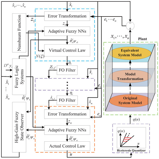 In this section, we propose an observer-based adaptive fuzzy quantized control scheme for FONTDS (9). First, a fractional-order, high-gain fuzzy state observer is constructed to estimate unavailable state information. Subsequently, the controller design and stability results are obtained by means of the FODSC technique, an indirect Lyapunov method, and a Lyapunov–Krasovskii functional.