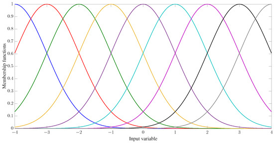 - where represents the sth rule, , and denotes the linguistic variables associated with the inputs and outputs of the FLSs. and are the fuzzy set. Then, the FLSs are described as