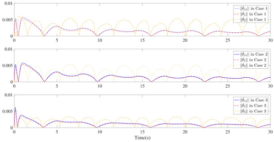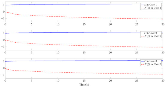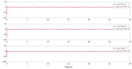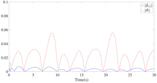 Furthermore, three kinds of performance index—integral absolute error (IAE), integral time-weighted absolute error (ITAE), and integral square error (ISE)—are introduced to quantify the tracking performance by choosing different control parameters. It can be concluded from Figure 6, Figure 7 and Figure 8 and Table 1 that better tracking performance can be achieved by increasing parameters and . Meanwhile, it is easily observed that the tracking performance is degraded by increasing the quantization parameter (), which also confirms that the larger the quantization parameter (), the coarser the quantizer. The trajectories of the Nussbaum parameters () and adaptive parameters () are depicted in Figure 9 and Figure 10, respectively. The curves of the control signal (u) and the quantized control signal () are presented in Figure 11. Although the tracking accuracy can be effectively enhanced by increasing , it follows from Figure 11 that more efforts need to be dedicated to this task. Therefore, a relative tradeoff between tracking performance and control cost can be achieved by selecting appropriate design parameters. In addition, Figure 2, Figure 3, Figure 4, Figure 5, Figure 6, Figure 7, Figure 8, Figure 9, Figure 10 and Figure 11 prove that the boundedness of the resulting signals can be guaranteed.