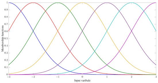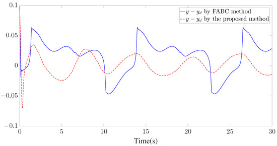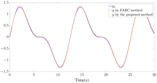 The control parameters, initial conditions, and disturbances are provided in Table 2. Similar to Example 1, seven GMFs uniformly distributed on are defined for fuzzy approximation as shown in Figure 13. Furthermore, the fuzzy adaptive backstepping control (FABC) method proposed in [8] is used to show the superiority of the proposed method. The comparative tracking performance results are exhibited in Figure 14 and Figure 15. Figure 14 displays the trajectories of the reference trajectory () and the system output (y). Figure 15 depicts the time response of tracking error () under different control methods. Figure 14 and Figure 15 show that better tracking performance can be achieved by using the proposed method in comparison to the FABC method proposed in [8]. The curves of parameter and the Nussbaum function () are plotted in Figure 16. The trajectories of adaptive parameters () and control signals () are shown in Figure 17 and Figure 18, respectively.